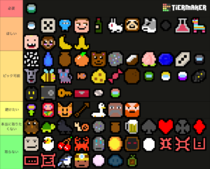 ドロボウ、ヒヨコ、チェリー、カニ、ゴーレム、コイン、信者、タマゴ、まじない、カササギ、鉱夫、パール、カキ、種
